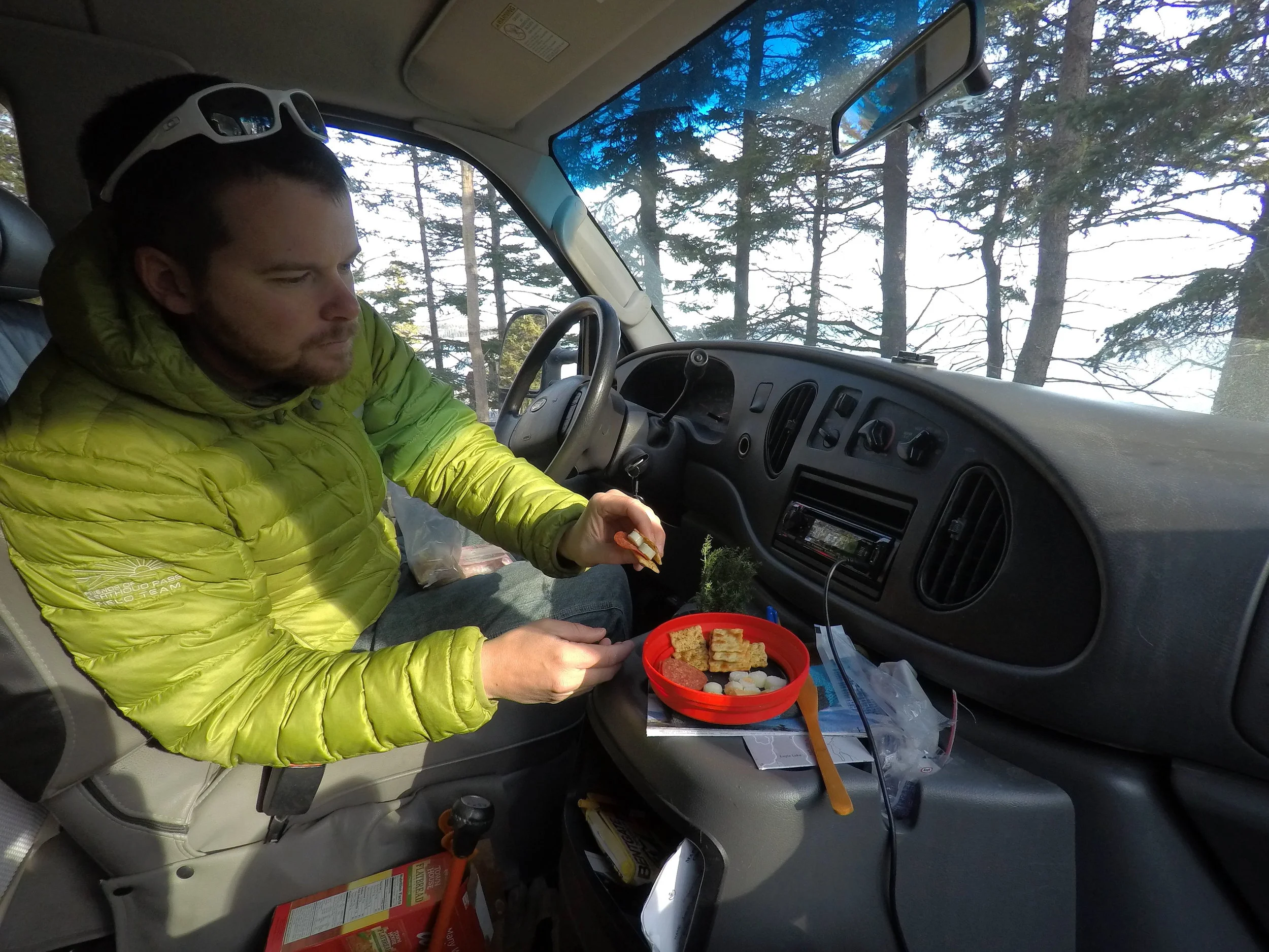 The drive east to Acadia National Park was beautiful! We arrived into Acadia at about 4:24, about 24 minutes after the visitor center closed. The lights were on and we could see that people were walking around inside so we decided to try our luck and pull on the door handle. Much to everyones surprise the door opened! (I don’t think the park rangers were happy that the door wasn’t locked) After a brief chat with the rangers, we realized we could be in for some real difficulties finding somewhere to sleep for the night. We called several places hoping they would be open.After resigning ourselves to the nearest Walmart parking lot, we got a phone call back from Hanscoms, a cabin rental property that is open year round on the outskirts of Bar Harbor. The decision to drive the 30 minutes back to Bar Harbor was an easy one, although we weren’t excited to be spending money on accommodations. The return to Bar Harbor meant that we could stick to our original plan of visiting the mostly closed Acadia National Park, something that was high on our list of places to visit.